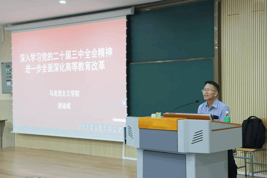联系我校实际,谢迪斌教授详细解读了全会提出的加快建设高质量教育体系的战略部署。他指出,该部署的关键在于全面而深入地推进育人方式、办学模式、管理体制及保障机制的改革进程,力求这些改革能够精准对接新时代教育发展的迫切需求与挑战。他还围绕优化高等教育布局、构建中国哲学社会科学自主知识体系以及构建中国话语和中国叙事体系进行了深入阐述。