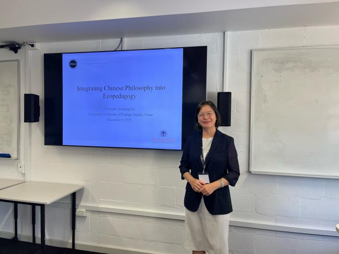柯晓玲副教授为第一作者的论文“Integrating Chinese Philosophy into Ecopedagogy: A Path to Ecowisdom”经同行评审后被本次年会接收,并在环境教育的未来与挑战分会场上进行了论文汇报和交流。该论文探讨了生态教育学两大关键分支,即批判教育学和哲学生态教育学的主要发展脉络,并提出了以批判教育学为基础,以哲学生态教育学为补充的生态教育学框架,最终目的在于培养生态智慧。论文进一步倡导将道家的学习、思维与行动方式融入教育实践并加强儿童哲学课程的开发。唯有如此,道家哲学传统才能在推进生态教育学和生态文明建设中发挥重要作用,实现与自然和谐共生、可持续发展和生态正义的目标。